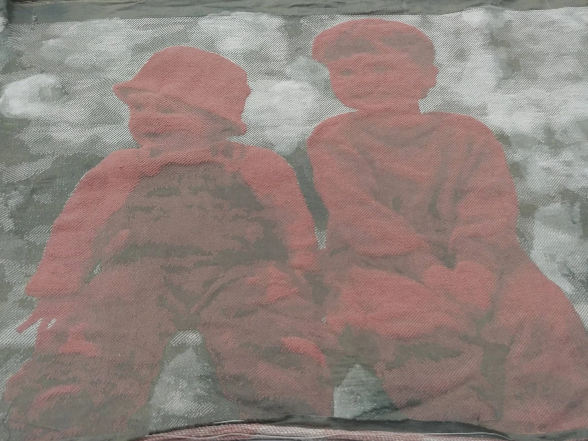 2-weft TC-2 weaving with acrylic and cotton yarns. Lightened with thiox and painted with iron and alum pastes before being overdyed with Marigold and Tumeric.